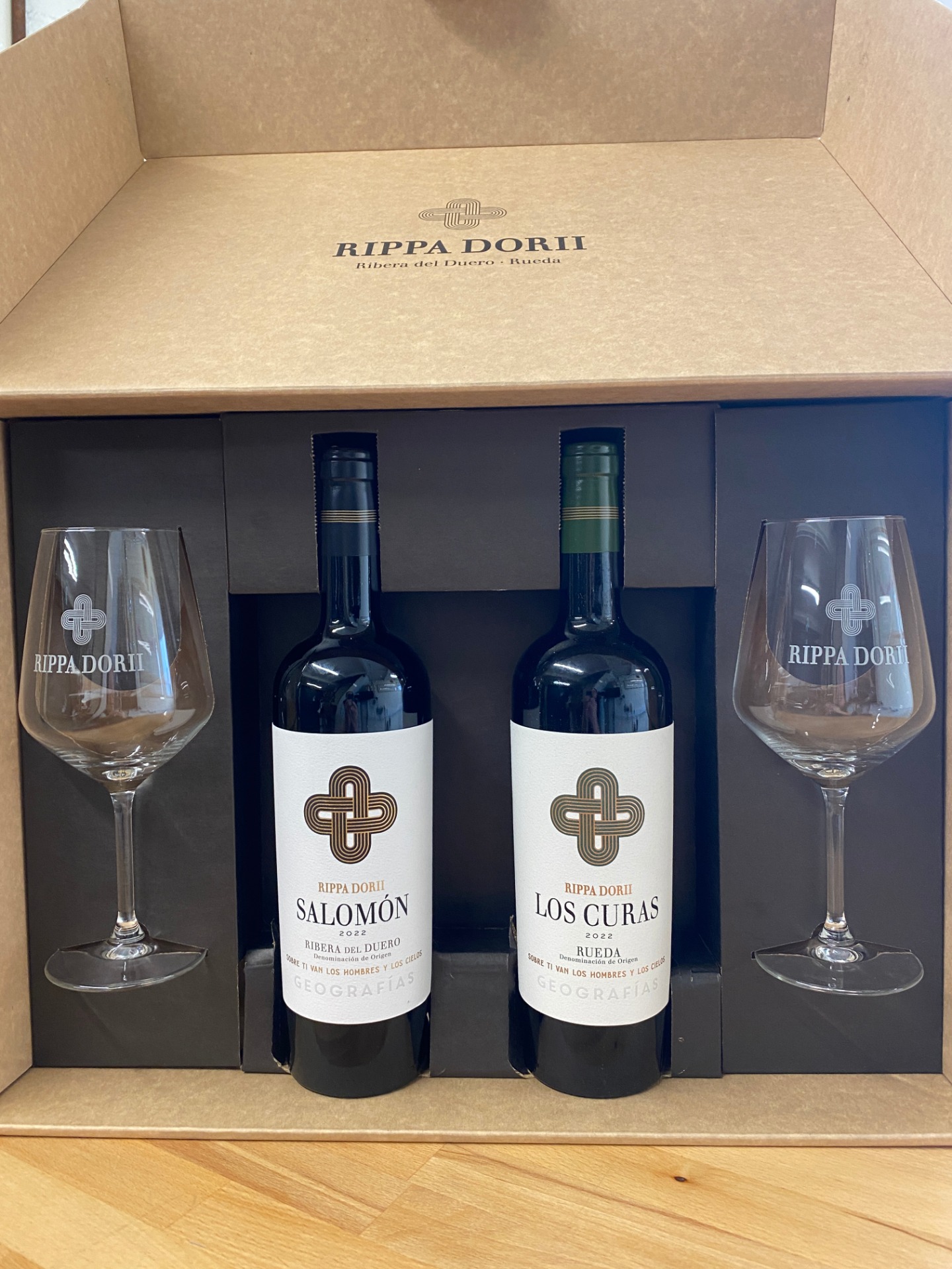 One bottle of each with 2 matching wine glasses in a presentation box. Perfect for Christmas.